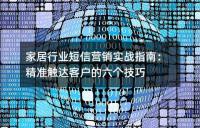 家居行业短信营销的六个实战技巧。通过活动造势、价值升级、场景营销、会员关怀、精准推送和价值展示等方式,实现精准触达客户。同时,文章还强调了短信营销的三个黄金法则。这些技巧和方法对于家居行业的企业在装修旺季进行有效的营销具有重要意义。