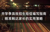 开学季高效招生短信编写指南,包括短信文案设计的五要素和黄金发送策略。文案设计需注重标题、课程亮点、时间呈现、互动设计和退订机制等方面;发送短信时需优选时段,控制发送频次,以吸引家长注意力并提高招生转化率。